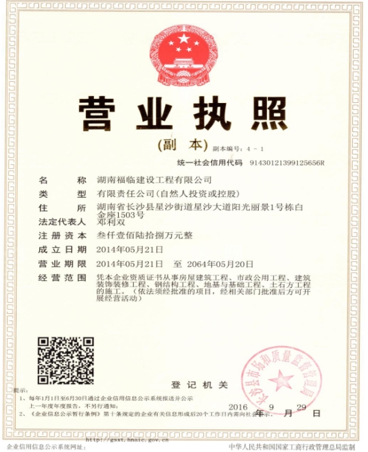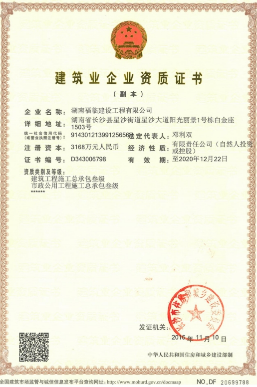 湖南福臨建設工程有限公司是經湖南省工商行政管理局登記注冊的有限責任公司。公司經國家建設部核定為建筑裝修裝飾工程專業承包貳級,房屋建筑總承包叁級;經營范圍還有:房屋建筑工程施工,市政公用工程施工,園林綠化工程服務,城市及道路照明工程施工,地基與基礎工程專業承包,消防設施專業工程承包,機電設備安裝專業工程承包,實驗室成套設備生產、加工,潔凈凈化工程設計與施工,輻射防護器材安裝,維護。是中國建筑裝飾協會理事單位、2006年被中國企業聯合會、企業家協會評為中國優秀企業、全國安全生產優秀企業...